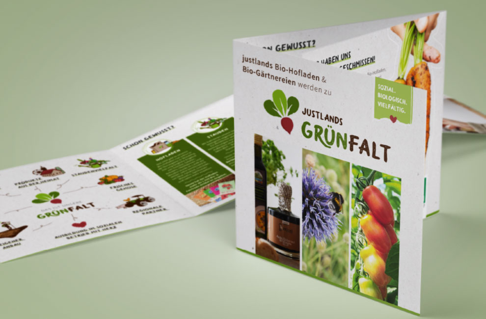 Wir durften uns für die drei Gewerke Hofladen, Gemüse und Staudengärtnerei ein neues Erscheinungsbild überlegen. Was als kleine Idee begonnen hatte ist nun die eingetragene Marke „Grünfalt“!